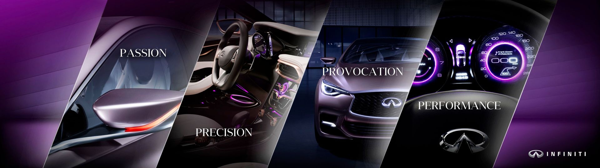 A l’instar des valeurs de Infiniti, l’univers graphique se veut élégant et à la pointe de la technologie.