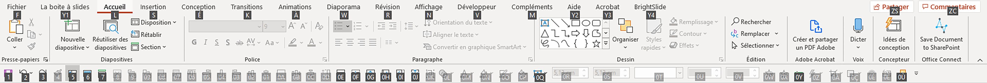 Appuyez une fois sur cette touche ALT et vous verrez apparaître des carrés noirs comportant des lettres ou des combinaisons de lettres et de chiffres au niveau du ruban. Utilisez alors la combinaison de votre choix pour atteindre l’action ou le menu souhaité : les raccourcis PowerPoint les plus pratiques pour gagner du temps !